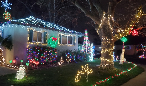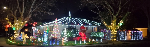 I have been adding to my house every year for 12 years now. It is a mix of inflatables, LED Lights, yard decorations, signs, etc... I have a hand built light tree with a PLC controlling the lights. There is an inflatable snowman and a giant inflatable teddy bear amongst some others. Most of the roof is covered with lights along with the chimney topped by a star. Hours of operation are 5:015pm to 12am |