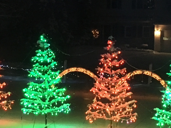 Christmas Light Show using Light-O-Rama software with 12,000 traditional lights and 4,500 RGB pixel bulbs. Tune radio to 107.9 FM. We play a couple holiday favorite songs each year, and feature a pixel matrix, pixel tree, singing Christmas trees, and nativity scene. |