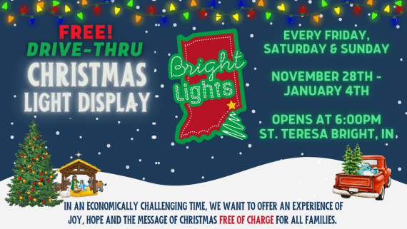St. Teresa Catholic Church in Bright, Indiana invites you to experience the wonder of the season at Bright Lights, a free drive-thru Christmas display that celebrates the joy, hope, and beauty of Christmas! Enjoy thousands of twinkling lights and faith-filled scenes that bring the true meaning of the season to life. The display is open Fridays and Saturdays from 6–10 PM and Sundays from 6–9 PM, November 28 through January 4. 🎶 Don’t miss the Opening Night Concert featuring My Brother’s Keeper on Friday, November 28 at 6:30 PM! Learn more at brightlightsindiana.com or call 513-788-2326. Come share the light and make Bright Lights part of your Christmas tradition! |