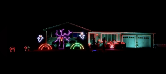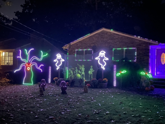 Over 4,000 computer controlled RGB pixels sequenced to over 20 of your favorite Halloween songs that includes singing ghost, pumpkins and spooky tree, leaping arches, bats, spiders and tombstone. Playlist includes songs such as Ghostbusters, Thriller, Spooky Scary Skeletons, Monster Mash and many others. |